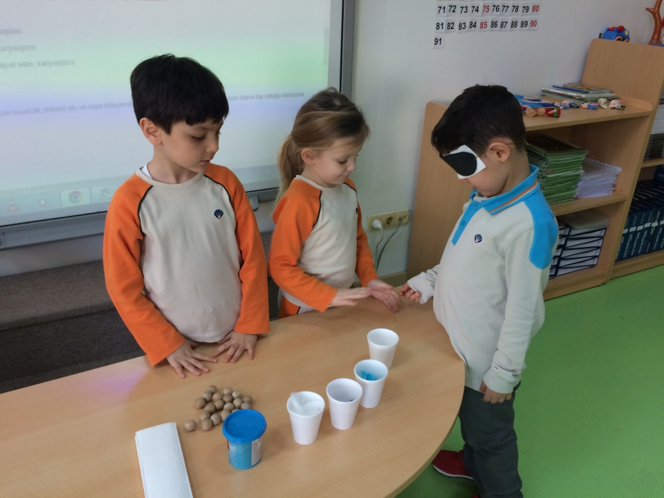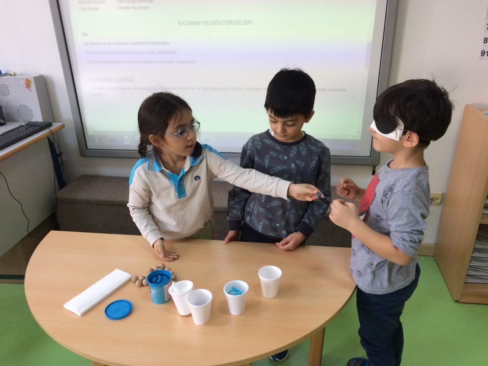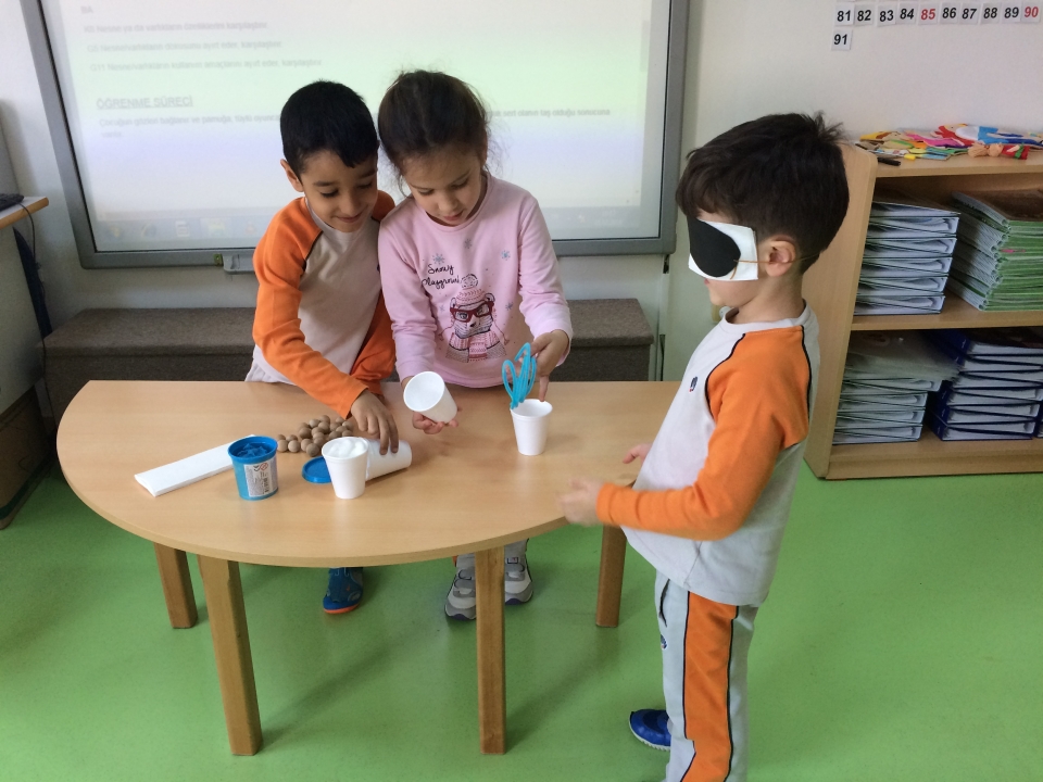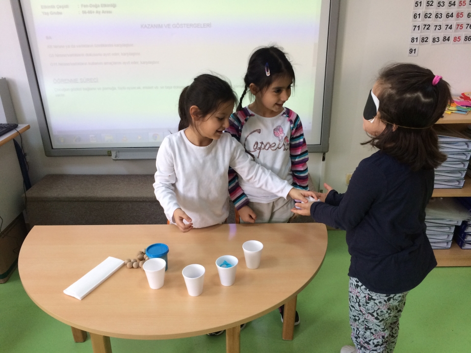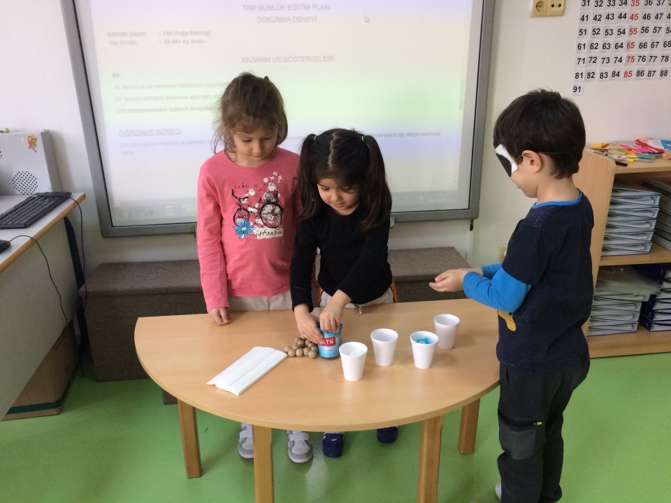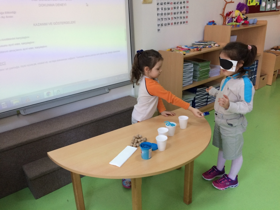 Gökkuşağı grubu öğrencileri nesne ve varlıkların kullanım amaçlarını ayırt ederek, karşılaştırma çalışması yaptı. Deney sırasında öğrenciler gözleri kapalı olarak arkadaşlarının verdikleri nesneleri tahmin ederek buldular. “Dokunma Deneyi ” sonrasında sert-yumuşak kavramları hakkında sohbet edildi. Nesne varlıkların dokusunu ayırt ederek arasındaki farklılıkları söyleyerek etkinlik keyifle tamamlandı.