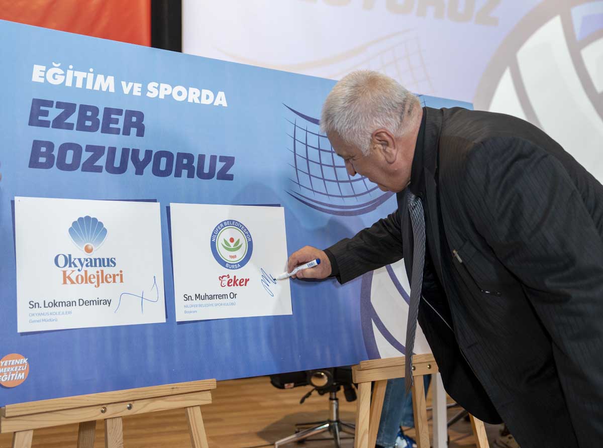 Sporcularının eğitim ve sporun birlikte yürütüldüğü bir okulda eğitim görecek olmasının önemine değinen Nilüfer Belediyesispor Kulübü Başkanı Muharrem Or, “Sporun aynı zamanda eğitimin bir parçası olduğuna inananlardanım. Spor, sanat ve kültür olmadan sadece akademik eğitimin bir işe yaramadığını tüm dünya eğitim sistemleri kabul etmiştir. Bu anlayışı uygulama konusunda bize yol açan Okyanus Koleji’ne teşekkür ediyorum. Artık bu işin meyvelerini toplama dönemindeyiz. Sportif olarak Nilüfer Belediyesispor Kulübü, Türk voleyboluna uzun yıllardır Sultanlar Ligi’nde hizmet eden ve orada başarıyla mücadele eden bir takım. Zaman zaman Avrupa kupasında da yer aldı takımımız. Bu yıl da takımımız önemli hamleler yapar hale geldi. Ekibimize teşekkür ediyorum” dedi.