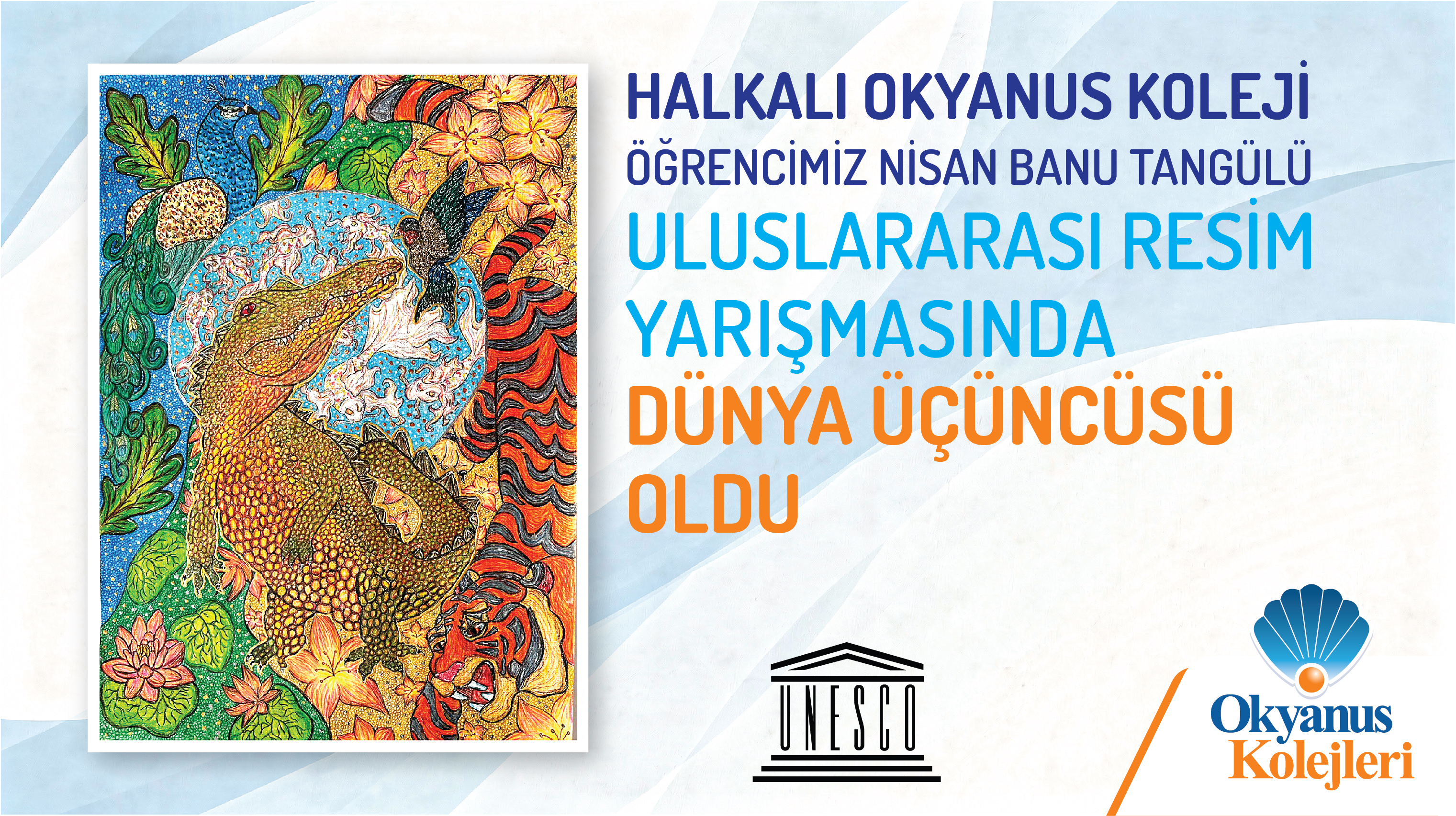 UNESCO Fransız Ulusal Komisyonu himayesinde Dünya Gençlik Sanat Enstitüsü (İMAJ) tarafından düzenlenen 33. Uluslararası "Graniesd’ Artistes du Monde Entier" resim yarışması sonuçlandı. Yaşamın Güzelliği: "Flora ve Fauna" temasıyla düzenlenen yarışmada, 72 ülkeden katılan 7400 eser arasından Halkalı Okyanus Koleji 10-B sınıfı öğrencimiz Nisan Banu TANGÜLÜ Dünya finalistleri arasına girerek (Norminees) diplomaya hak kazanarak aynı zamanda kendi yaş grubunda Dünya üçüncüsü olmuştur. Öğrencimizi Ailesini, Görsel Sanatlar öğretmenimiz Özlem Barni ŞAHİN’i tebrik ediyor, başarılarının devamını diliyoruz.