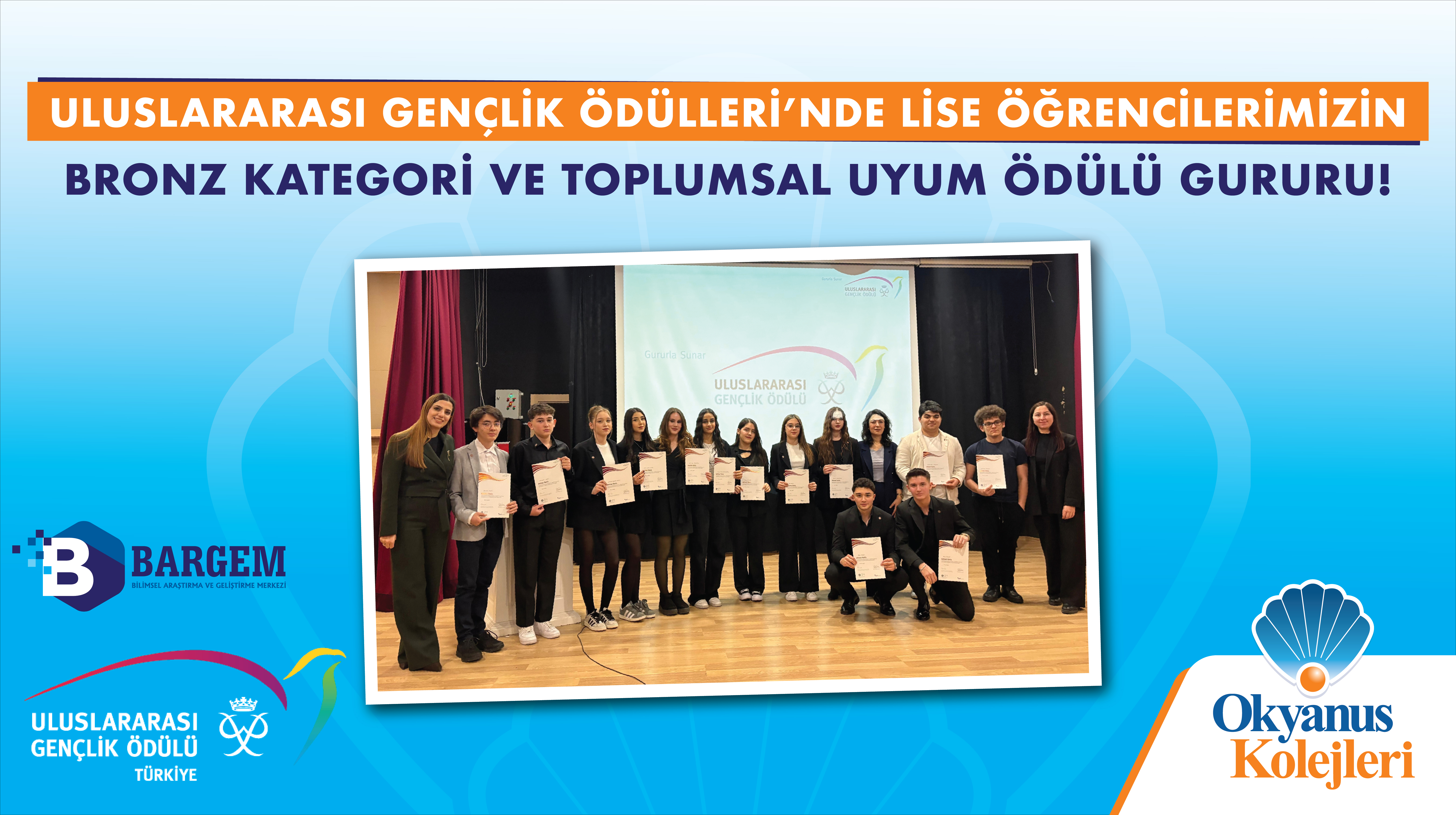 Eryaman Okyanus Koleji Lise Kademesi öğrencileri, Uluslararası Gençlik Ödülleri Programı kapsamında Bronz Seviyeyi başarıyla tamamlayarak önemli bir başarıya imza atmıştır. Geçtiğimiz yıl Bronz Kategoriyi tamamlayan 13 öğrencimiz, bu yıl Gümüş Kategori çalışmalarına başlamıştır. Geçen hafta düzenlenen törende Bronz Kategoriyi tamamlayan öğrencilerimize sertifikaları takdim edilmiştir.