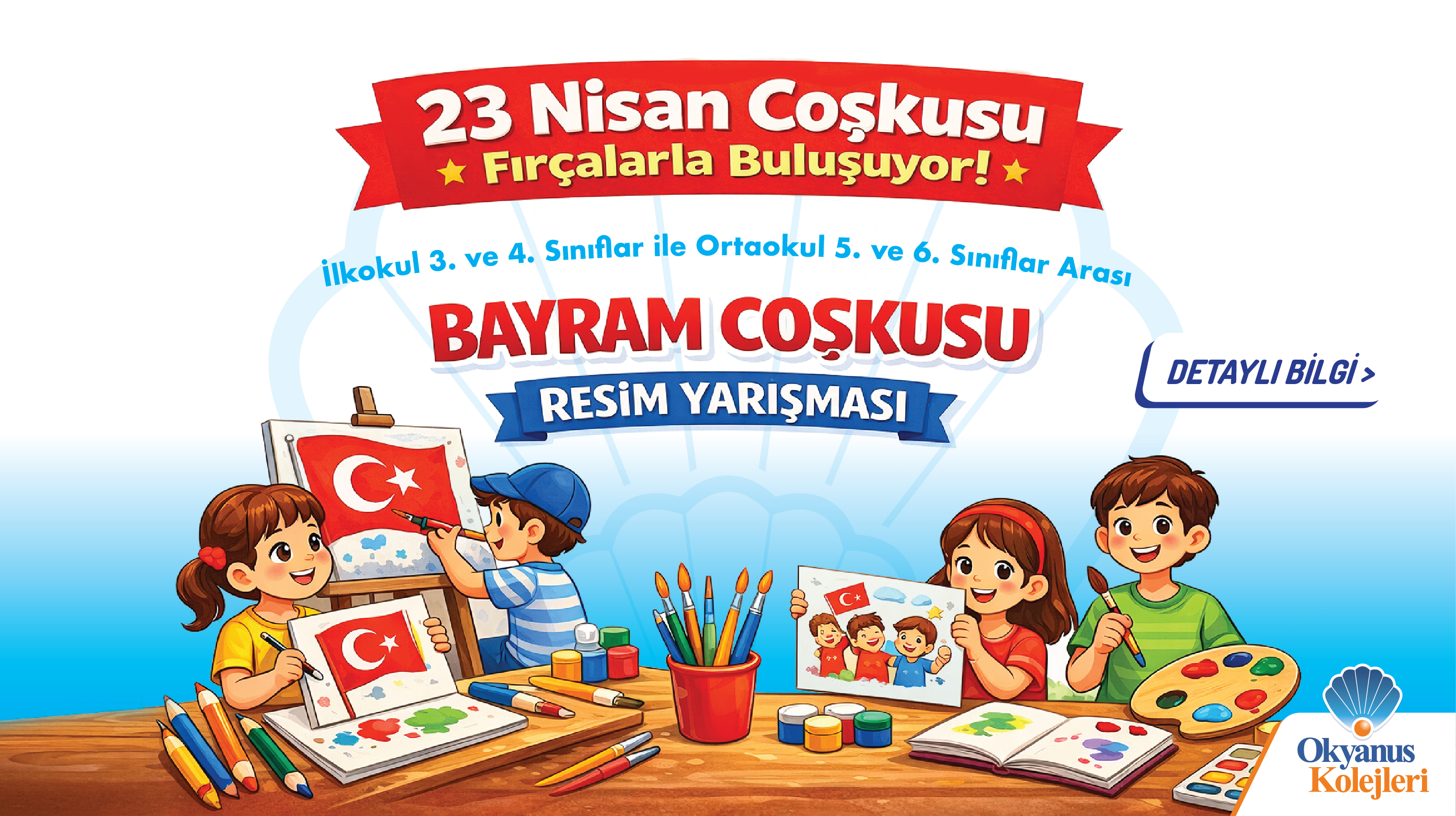 Okyanus Kolejleri tarafından 23 Nisan Ulusal Egemenlik ve Çocuk Bayramı kapsamında ilkokul 3-4. sınıf ve ortaokul 5-6. sınıf öğrencilerine yönelik “Bayram Coşkusu” temalı resim yarışması düzenlenmektedir.