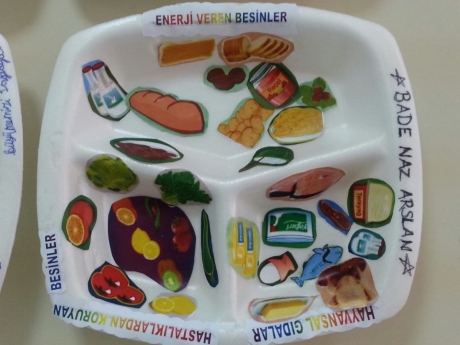 Etkinlikte öğrencilerimiz üç bölümlü köpük tabağa yiyeceklerimizi “Enerji veren besinler,Hastalıktan koruyan besinler ve Boyumuzu uzatan besinler” olarak ayırıp yapıştırdılar.Böylece dengeli beslenmek için gerekli olan yiyecekleri tanımış oldular.