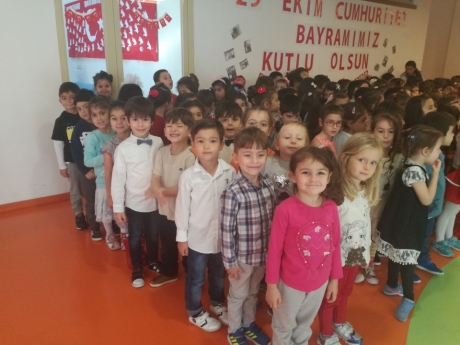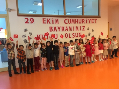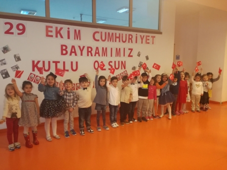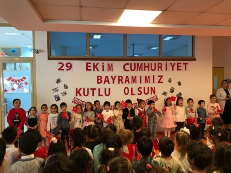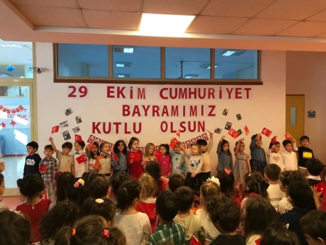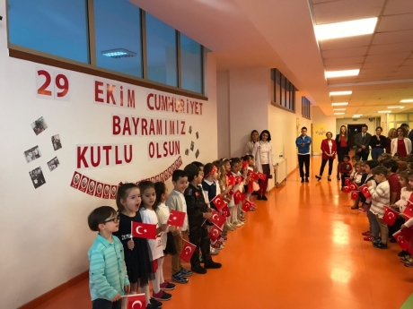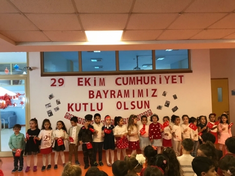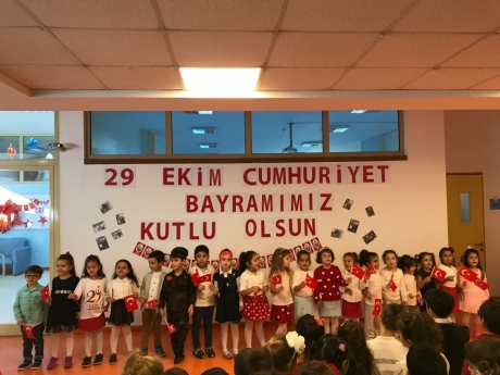 Törenimiz, öğrenci ve öğretmenlerimizin saygı duruşu ve ardından İstiklal Marşı’nın okunmasıyla başladı. Tüm öğrencilerimiz müzik öğretmenimizin çaldığı piyano eşliğinde “Cumhuriyet Marşı”nı söylediler. A,B ve C grubu öğrencilerimizin şiirlerini okumasının ardından 10. Yıl Marşı eşliğinde bayraklarını dalgalandırdılar. Sınıflarımızda “29 Ekim Cumhuriyet Bayramı”nı müzik eşliğinde dans ederek coşku ile kutladılar