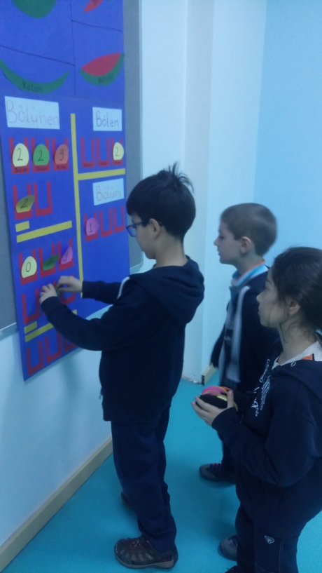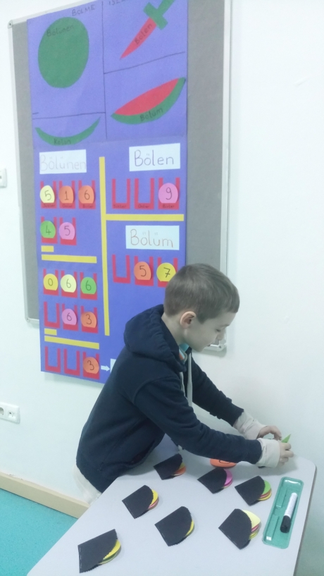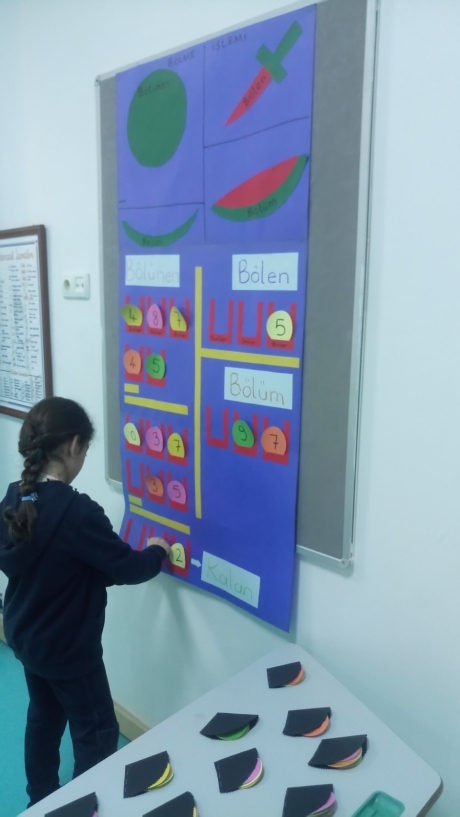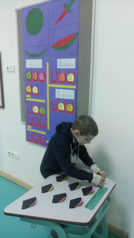 Öğretmen çocuklar için hazırlamış olduğu ders materyali ile sınıfa canlı bir giriş yapar. Çocuklara sırayla, hazırladığı rakam keselerinden farklı rakamlar çektirerek bölme işleminde hangi bölgelere yerleştireceklerinin yönergelerini verir ve son olarak bölme işlemi kurallarına uygun olarak hesaplatır. Daha sonraki aşamada; diğer arkadaşlarıyla beraber işlemin sağlamasını yapacak kontrol grubu oluşturulur. Bu sırada öğretmen çocukları sadece rehber sorularla yönlendirmektedir.