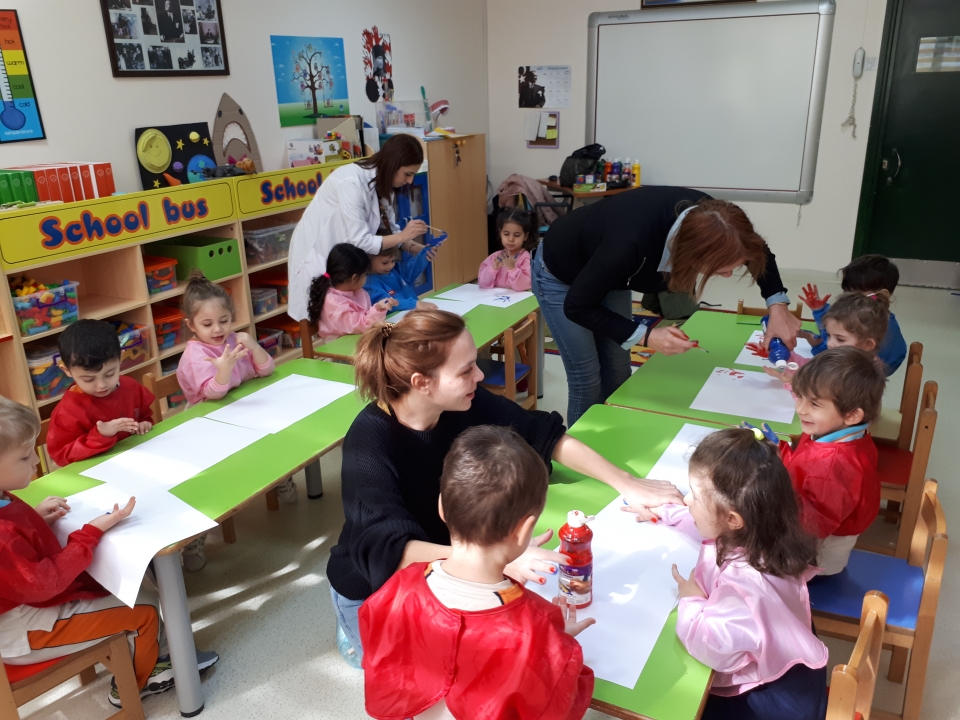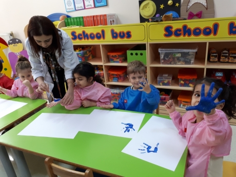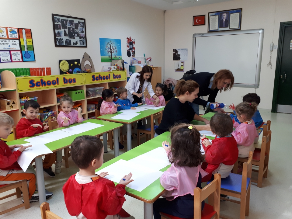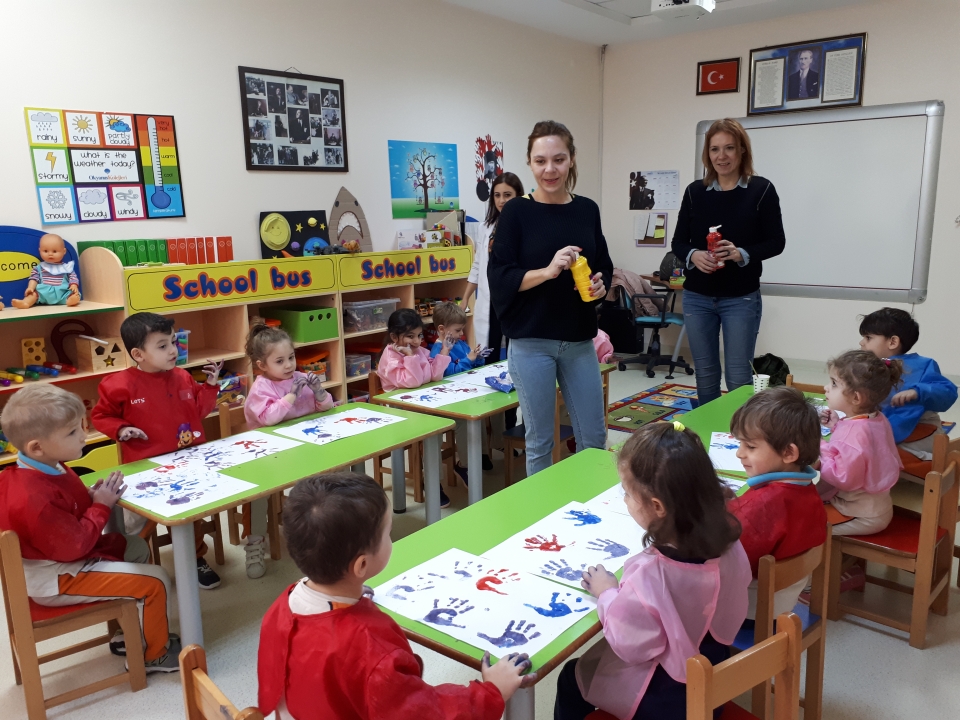 Rüzgar Grubu öğrencileri , aile katılımında Deniz KÜÇÜKDENİZ ‘in annesi Banu Hanımı ve teyzesi Yonca Hanımı sınıflarında misafir ettiler. Önce ana renkleri ardından ara renkleri tanıdılar. Banu Hanım ve Yonca Hanım Parmak boyaları kullanarak Rüzgar Grubu öğrencilerinin bir eline “kırmızı” bir eline “mavi” rengi sürerek el baskısı yaptılar daha sonra iki elini birbirine sürerek renk karışımı oluşturan Rüzgar Grubu öğrencileri ara renk olan “mor”u elde ettiler. Aynı işlemi “sarı” ve “kırmızı” rengi karıştırarak “turuncu” rengi elde ettiler ve el baskıları oluşturdular. Deniz arkadaşlarına “pastel boya” hediye etti. Keyifli bir şekilde etkinlik sürecini tamamladılar. Katılımlarından dolayı Banu Hanım ve Yonca Hanıma teşekkür ederiz.