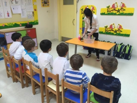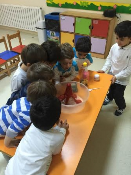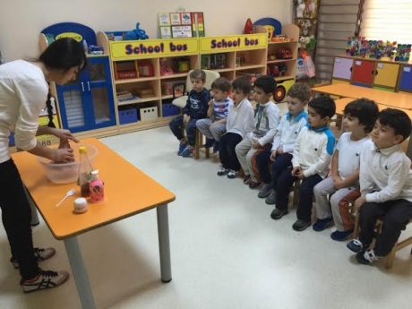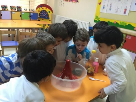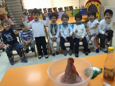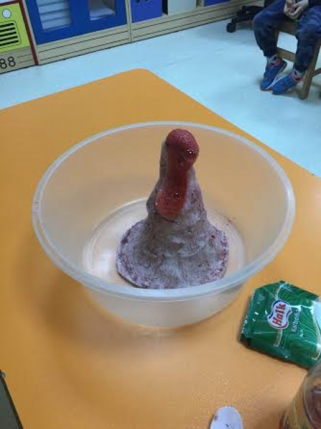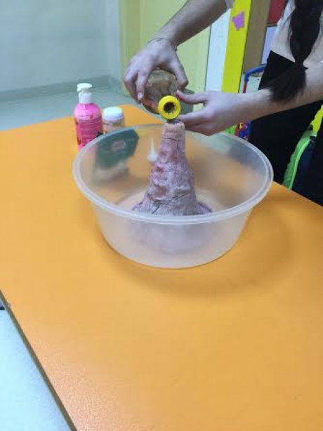 Deney için gerekli olan, karbonat, kırmızı gıda boyası ve sirkeyi sırasıyla kabın içine boşalttık. Malzemelerimiz birleşince kabardı ve kabımızdan taşmaya başladı. Bizde bu şekilde Yanardağın içindeki lavların nasıl taştığını öğrendik.