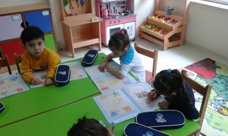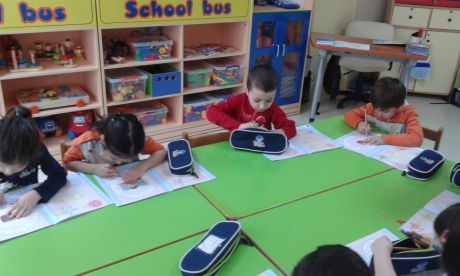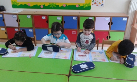 Şekillerin genel tekrarının olduğu sayfayı açan öğrenciler öğretmenlerinin yönergesiyle her şekli istenilen renge göre boyayarak çalışmalarını dikkatli bir şekilde yaptı. Yapılan çalışmanın ardından sınıftaki nesnelerin şekilleri hakkında sohbet edilerek ders pekiştirildi.