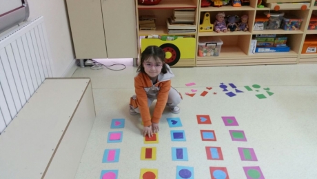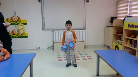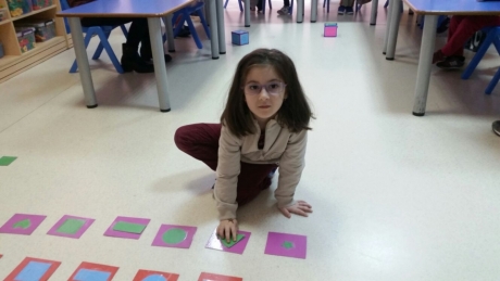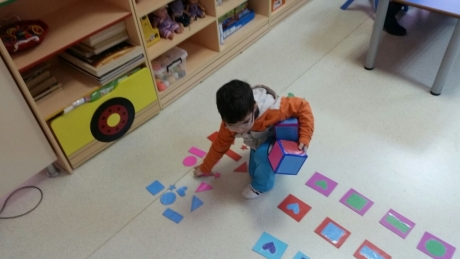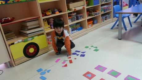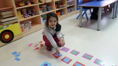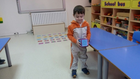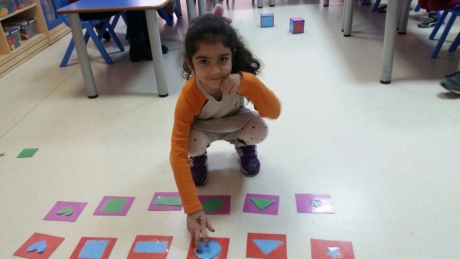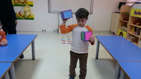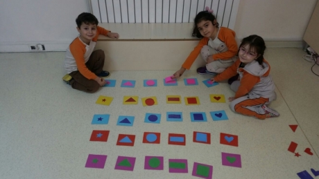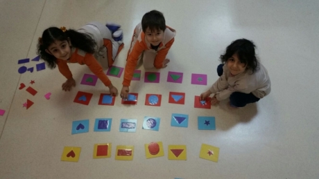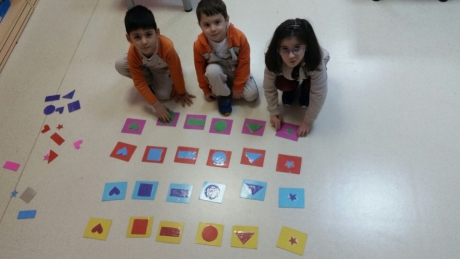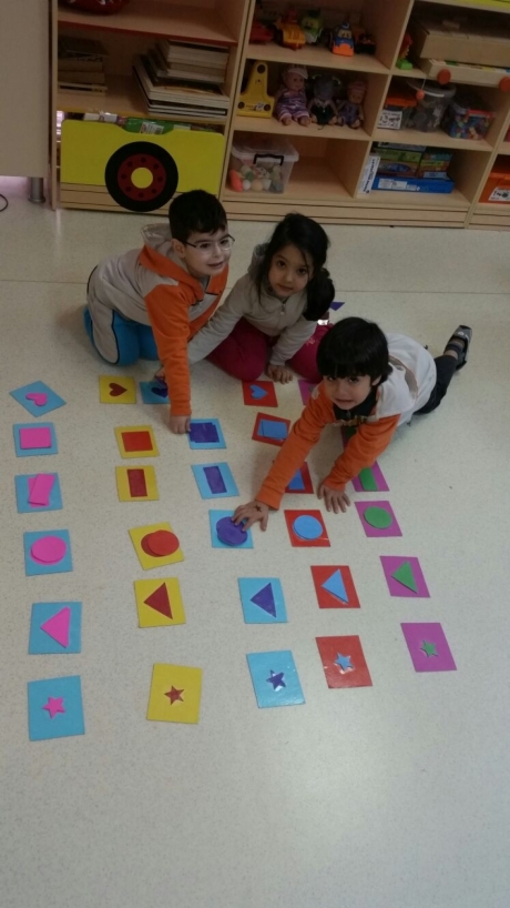 Öğrenciler eşleştirme kartlarını incelediler. Üzerinde şekil ve renk olan iki adet zar bulunan oyunda çocuklar zarları atıp belirlenen şekil ve renkteki kartları bulup yerleştirme işlemini yapmak için oldukça heyecanlı bir bekleyiş içine girdiler. Her öğrencinin başka bir arkadaşını oynaması için seçmesiyse oyunun diğer bir eğitici parçasıydı.