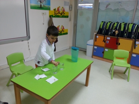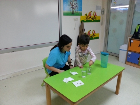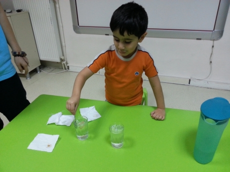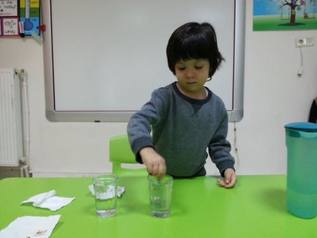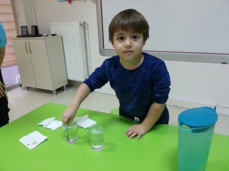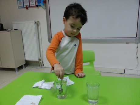 Eriyen ve erimeyen maddelerin neler olduğunu öğrenebilmek için ufak bir deney çalışması yaparak gözlemler yapmaya başladık. İki bardağa su doldurduk ve her birine farklı maddeler atmaya başladık. “şeker, tuz, tahta, demir vb.” Her maddeyi suya atınca karıştırarak eriyip erimediğini gözlemledik.