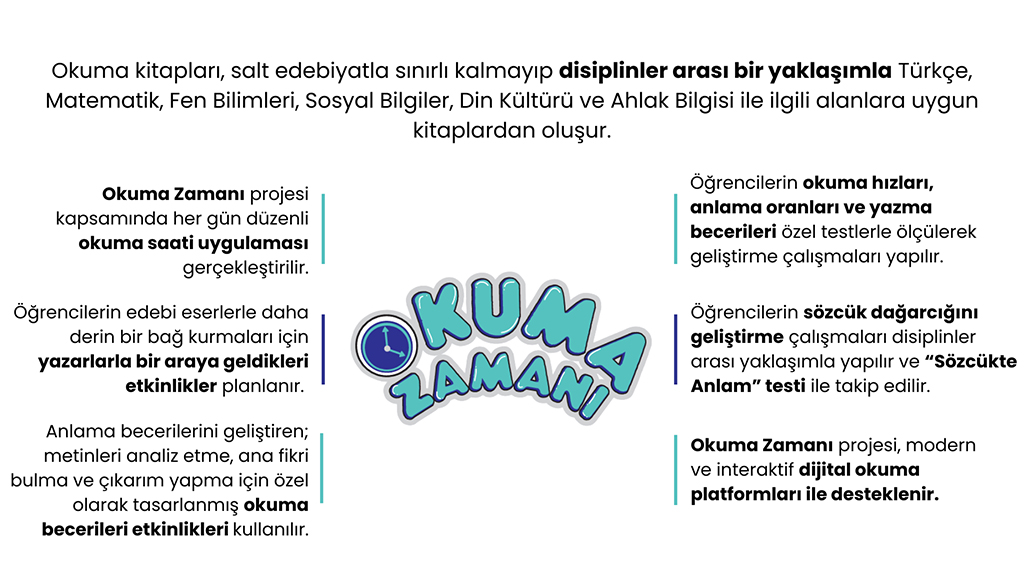“Okuma Zamanı” projesi ile öğrencilerin okuma alışkanlıklarını güçlendirme ve okuma becerilerini en üst seviyeye taşıma hedeflenir. Disiplinler arası okuma programı, sadece ders başarısını değil, aynı zamanda eleştirel düşünme ve derinlemesine anlama yeteneklerini de geliştiren kapsamlı bir okuma kültürü oluşturmayı amaçlar.